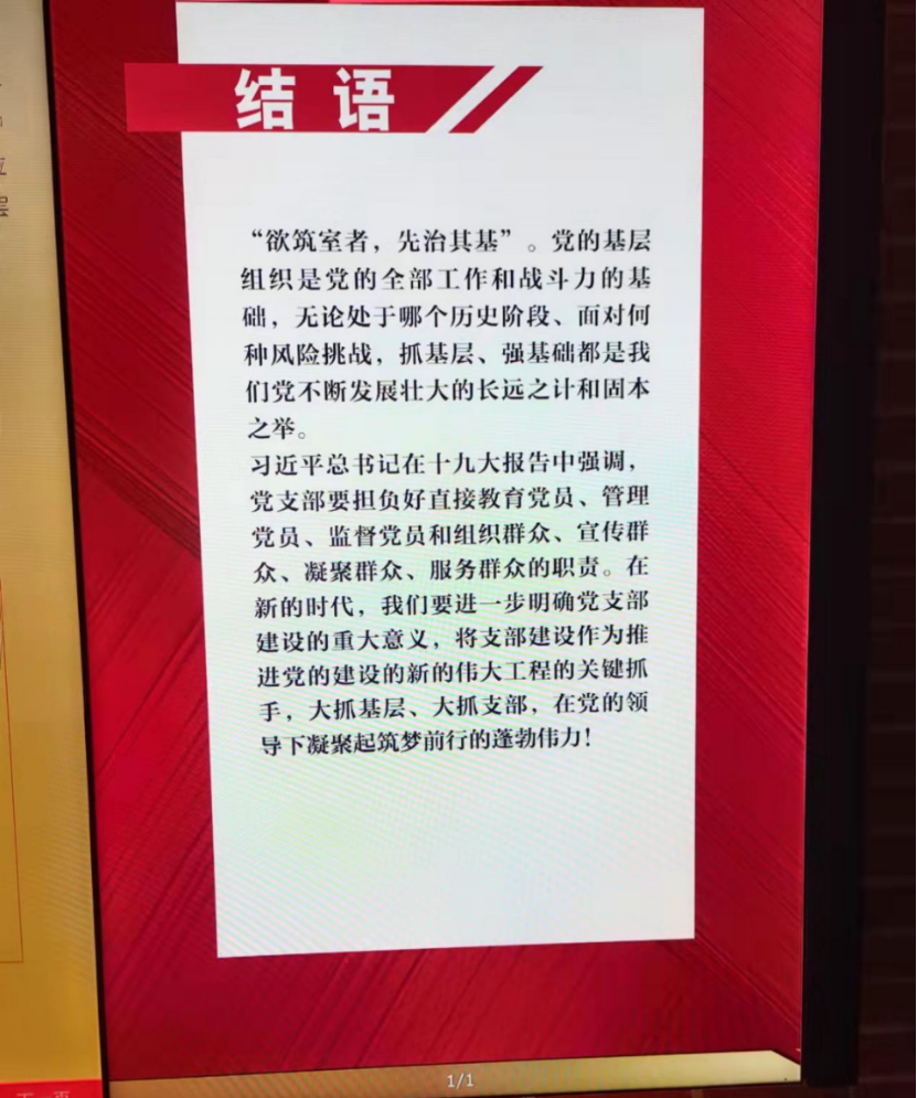 展厅最后,结语上赫然写着“欲筑室者,先治其基”,以及习近平总书记在十九大报告中对党支部的要求。这意味着每一位党员都要服从教育、规范自身、服务群众、凝聚群众,为复兴中华尽职尽责。