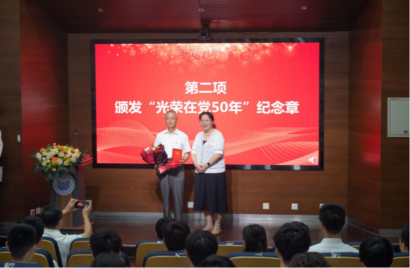 黄片 党委书记杨晓杰为黄片 “光荣在党50年老党员同志代表王国建教授颁发光荣在党50年纪念章。