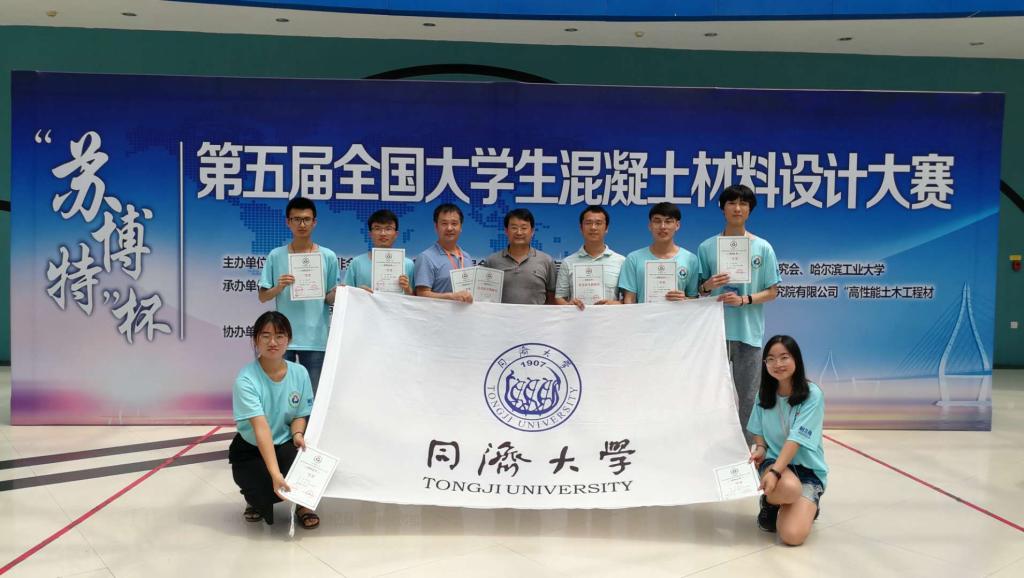 参赛。经过两个多月的紧张备赛,两支队伍在比赛中稳定发挥,在实践操作环节两支队伍设计的混凝土配合比均只经过一次拌和便达到了大赛规定的各项要求。最终由刘广、李祖悦、王将组成的同济一队获得团体一等奖,赵朋成、李磊、钱潘悦组成的同济二队获得团体二等奖。佘安明老师和朱洪波老师荣获优秀指导教师奖。