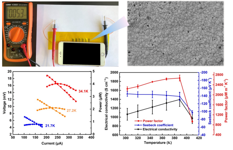 将复合膜组装成6个热电单臂柔性热电器件在温差34.1 K时的最大功率密度高达37.6 W m-2。归一化的最大功率密度PDmax·l/ΔT2也高于已报道的柔性热电器件的值。将该6臂器件放置于刚运行过游戏软件的手机下,手机温度与室温9.4 K的温差下,该柔性热电器件产生了5.3 mV的电压。表明这种超高性能柔性热电薄膜在可穿戴设备中有潜在的应用。上述工作以 “Exceptionally high power factor Ag2Se/Se/polypyrrole composite films for flexible thermoelectric generators”为题发表于Advanced Functional Materials上。论文第一作者为黄片 硕士生李雅婷,通讯作者为蔡克峰教授,共同通讯作者为南方科技大学何佳清教授。