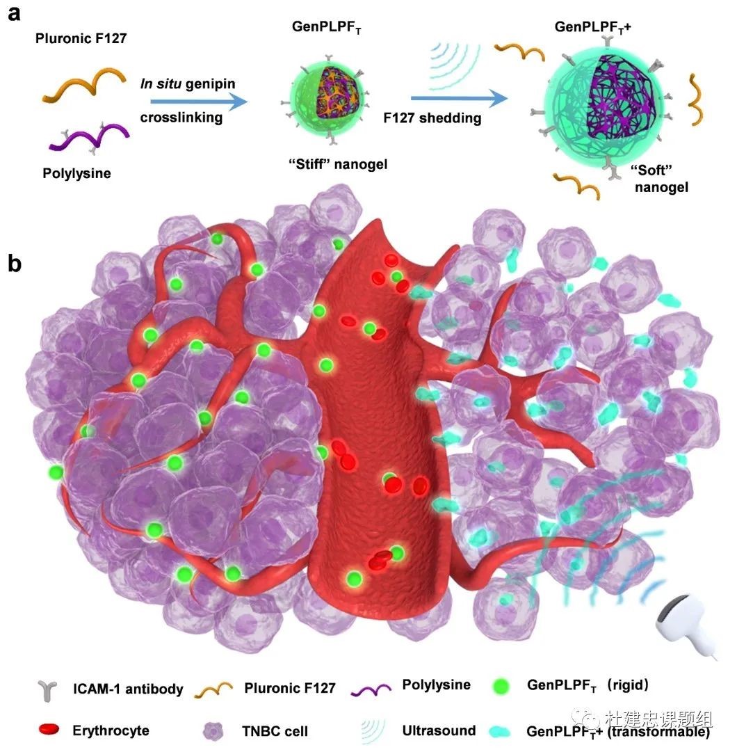 首先将能够靶向三阴性乳腺癌的 ICAM-1 抗体接枝于聚赖氨酸,并与Pluronic F127共组装,然后加入京尼平(Genipin)来交联聚赖氨酸,最终形成稳定的纳米凝胶。该凝胶能够在血液中长期保持稳定,实现长效循环。通过在病灶部位施加超声,促进Pluronic F127从纳米凝胶脱落,使得该纳米凝胶获得更优的形变性能,其杨氏模量从 336.78降低到 3.93 kPa,从而实现肿瘤深层渗透。