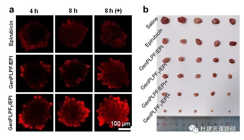图2(a)体外三阴性乳腺癌模型模拟多肽纳米凝胶的渗透性能;(b)体内抗肿瘤效果。