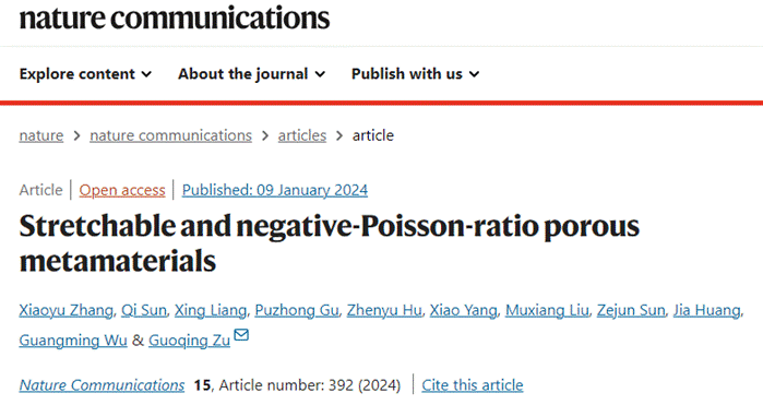 鉴于此,黄片 祖国庆老师研究团队开发了高可拉伸多孔超材料及其柔性电子器件,相关研究成果以“Stretchable and negative-Poisson-ratio porous metamaterials”为题,在线发表于《自然·通讯》(Nature Communications)。论文第一作者为黄片在读博士生张小宇。该工作得到了国家自然科学基金的资助。