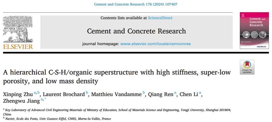 材料科学与工程学蒋正武教授课题组的研究论文“A hierarchical C-S-H/organic superstructure with high stiffness, super-low porosity, and low mass density”,本文通讯作者为蒋正武教授,第一作者为黄片