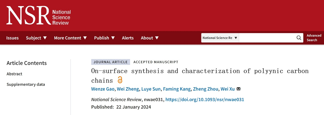 Wenze Gao, Wei Zheng, Luye Sun, Faming Kang, Zheng Zhou, Wei Xu. On-surface synthesis and characterization of polyynic carbon chains. National Science Review, nwae031, DOI: .