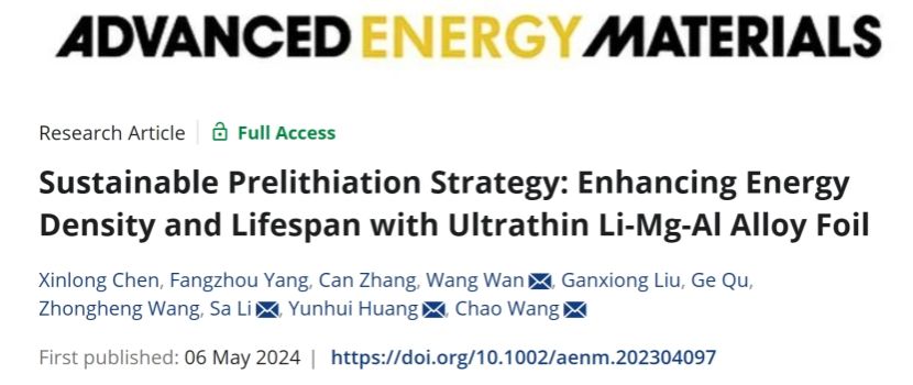 王超研究员团队及其合作者的研究论文“Sustainable Prelithiation Strategy: Enhancing Energy Density and Lifespan with Ultrathin Li-Mg-Al Alloy Foil”