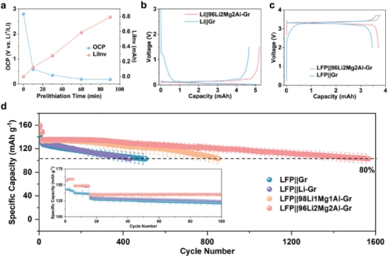 该论文基于储能型磷酸铁锂石墨电池体系,使用自制超薄锂镁铝合金实现无损高效的接触预锂化,并提出了能够不断补充电池循环过程中锂损失的持续补锂设计原则。基于此方法,1000圈后电池容量提升了32.4%,电池预期循环寿命能延长至对照组的三倍。