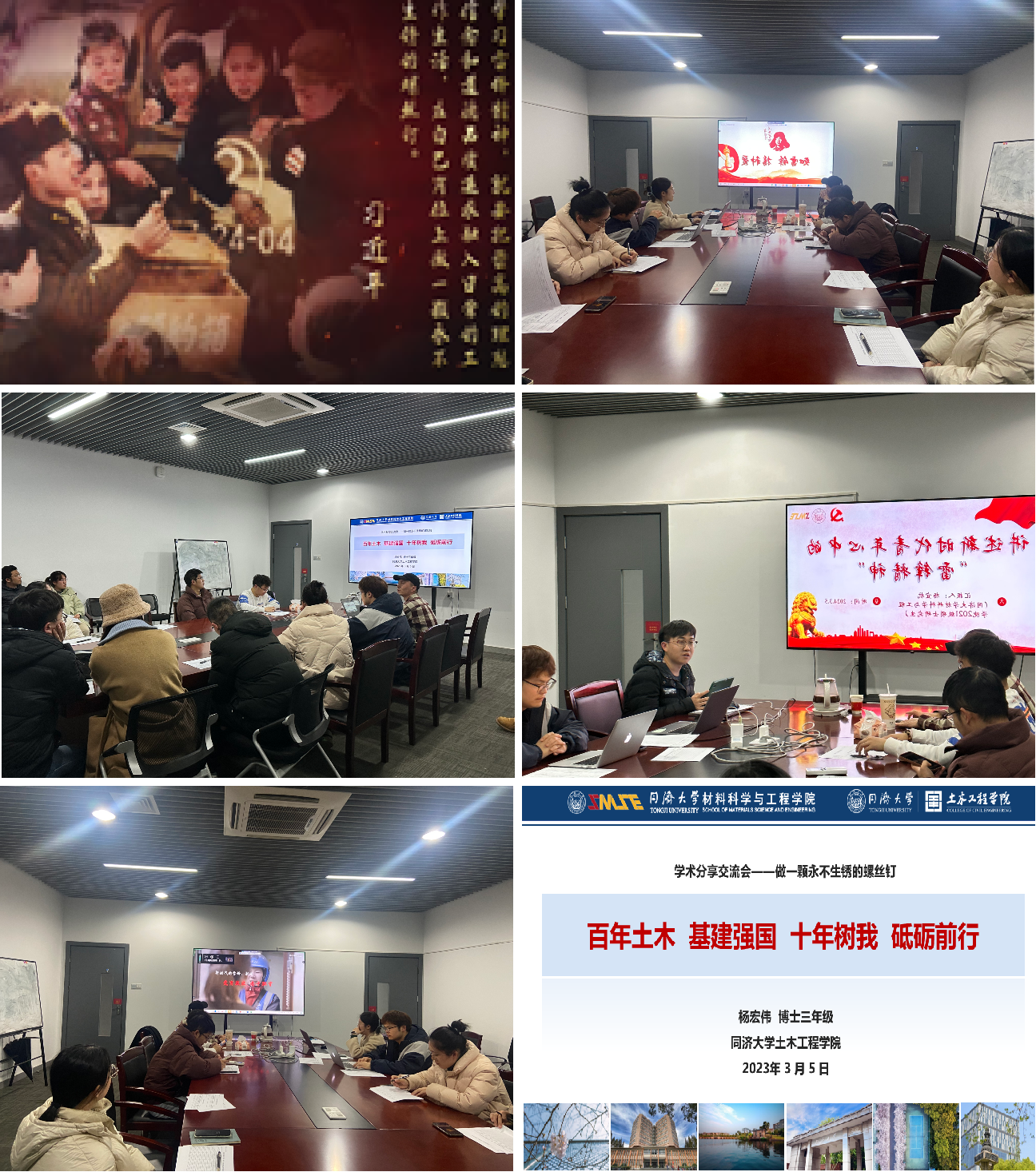 的优秀博士杨宏伟同学进行科研分享,他深入浅出地为我们介绍了土木工程在国家建设中以及自然灾害防护中的巨大作用;紧接着又为我们讲解了科研的思路与方法。在我看来,优秀的科研工作者需要像他一样心怀理想,脚踏实地,目标清晰,热情洋溢。杨宏伟同志谈及,“做一颗永不生锈的螺丝钉”,即我们每个人把自己的本职工作做好,脚踏实地,坚定前行。