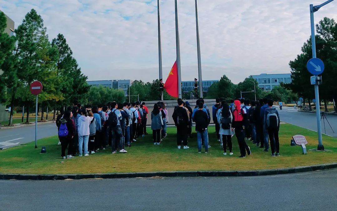 退伍大学生组成的国旗护卫队将鲜艳的五星红旗缓缓升入同济校园的天空,全体师生齐唱国歌。