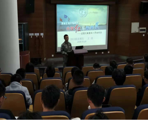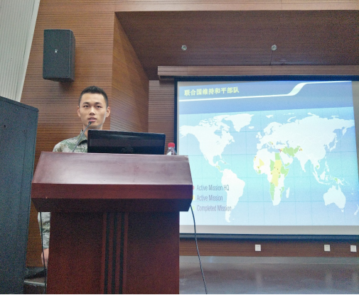 接着,王涛博士生动讲述了中国“蓝盔”的使命担当。1990年4月,我国首次参加联合国维和行动,我国累计派出维和军事人员3.7万余人次。维和任务危险重重,扫雷排爆随时都会有生命危险,虽然危机四伏,但是中国的维和人官兵克服了一切的困难在死亡“雷场”旁建立了“蓝线”和平界桩,顶着40℃的高温高质量的完成蓝桶修建任务,他们的努力得到了联合国的认可,获得了维和部队最高集体荣誉奖——“司令嘉奖”。