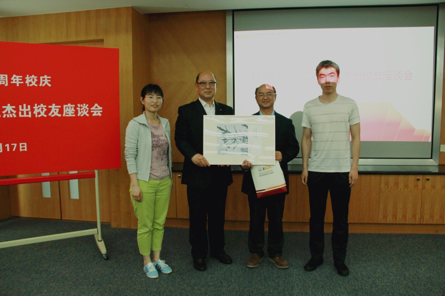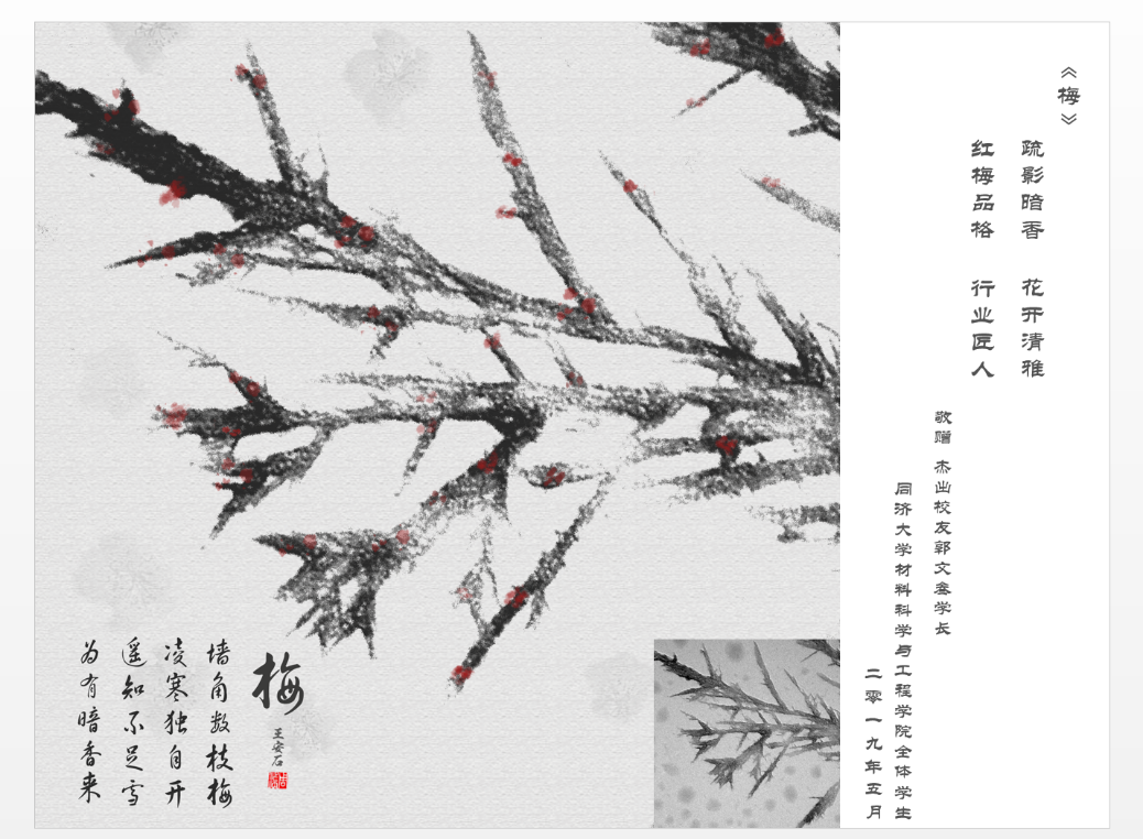 微结构大赛特等奖作品:《梅》,并赋诗一首:“疏影暗香,花开清雅,红梅品格,行业匠人”,以表达对学长的敬仰之情。学院党委书记王中平和学科委员会主任黄云辉向郭文叁校友和胡金华校友赠送纪念证书,感谢两位校友对黄片