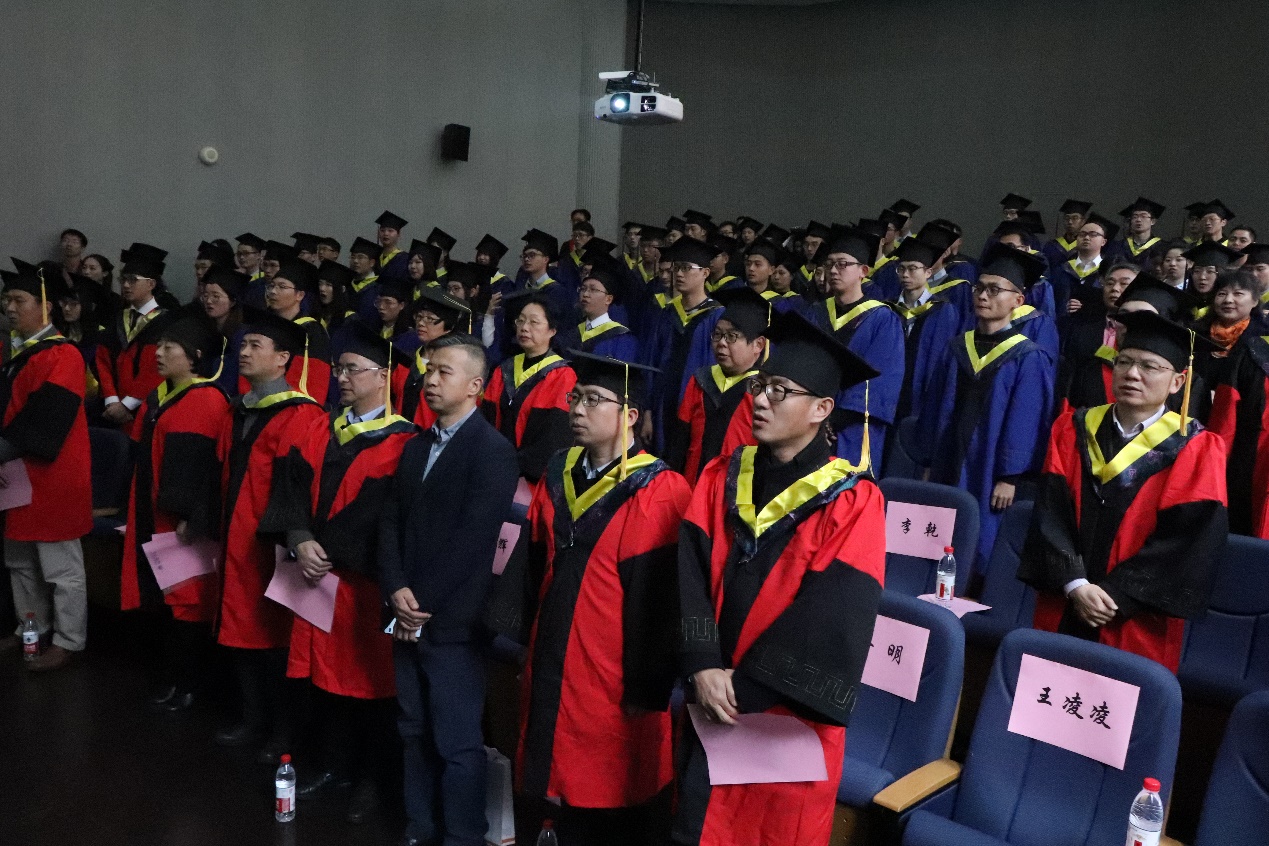 典礼在雄壮的国歌声中拉开序幕,典礼伊始,学院学科委员会主任黄云辉致辞,他对全体毕业研究生致以最美好的祝福,有感于同学们数年年坚持的不懈努力,欣慰于同学们终于成长为于国于家有望的人,黄老师同时也向提出了几点希冀,希望毕业生能够牢记知行合一的行事宗旨,在未来的工作生活中真正的践行“仰望星空,脚踏实地”的信念,并牢记黄片