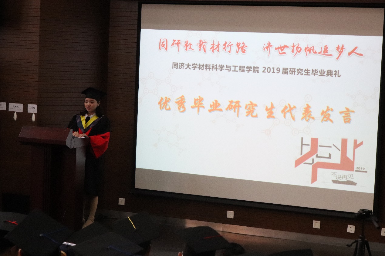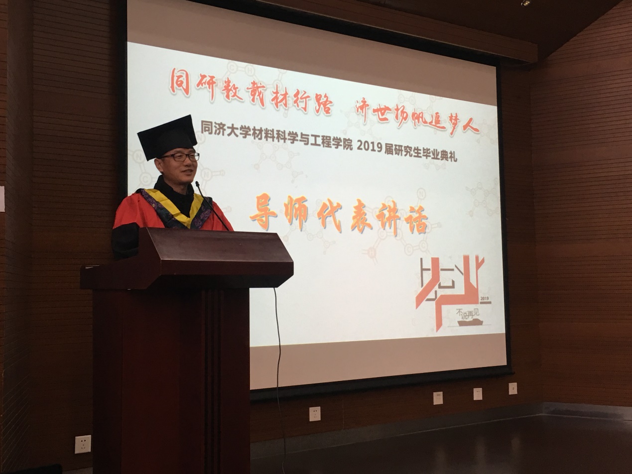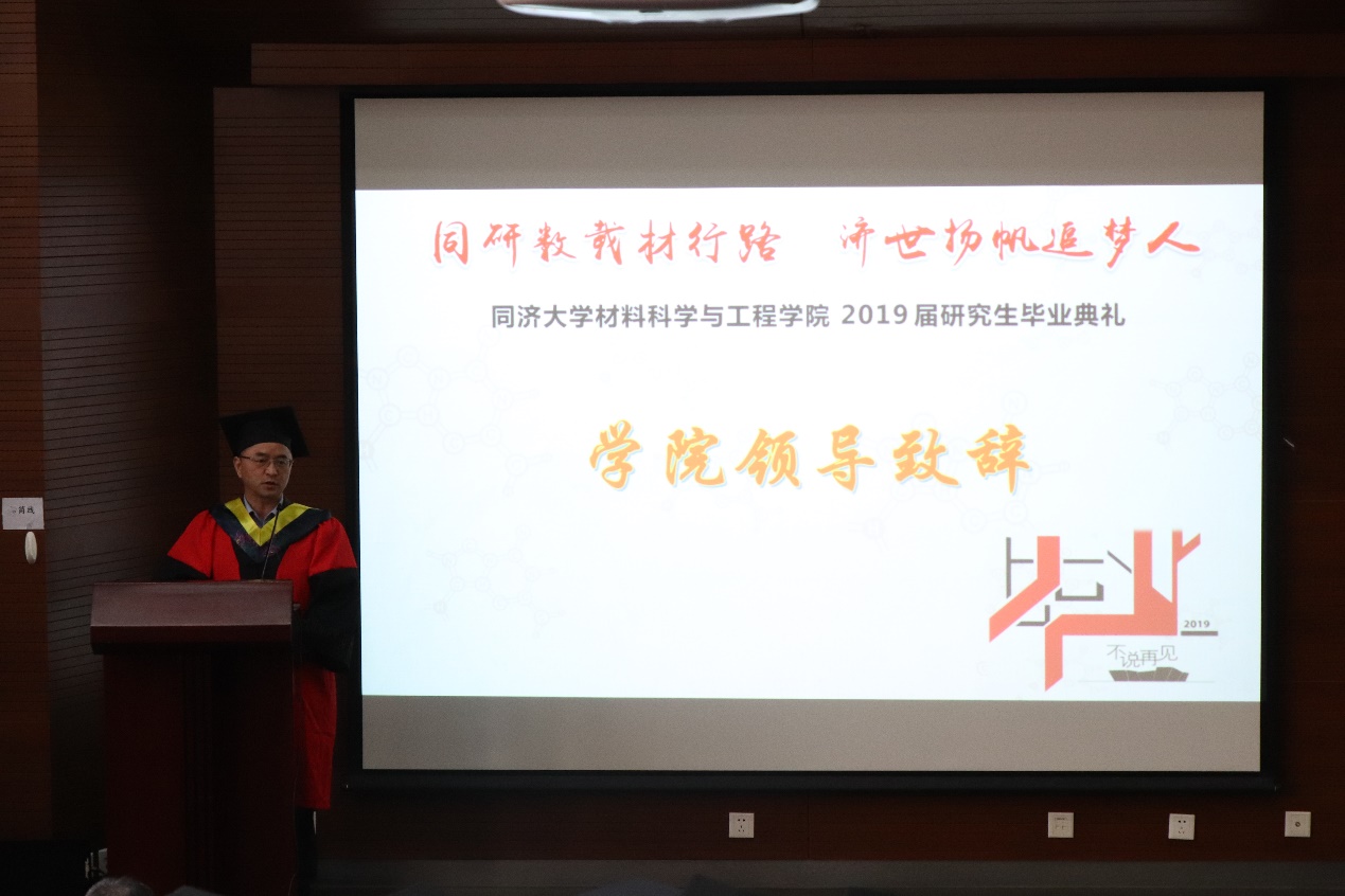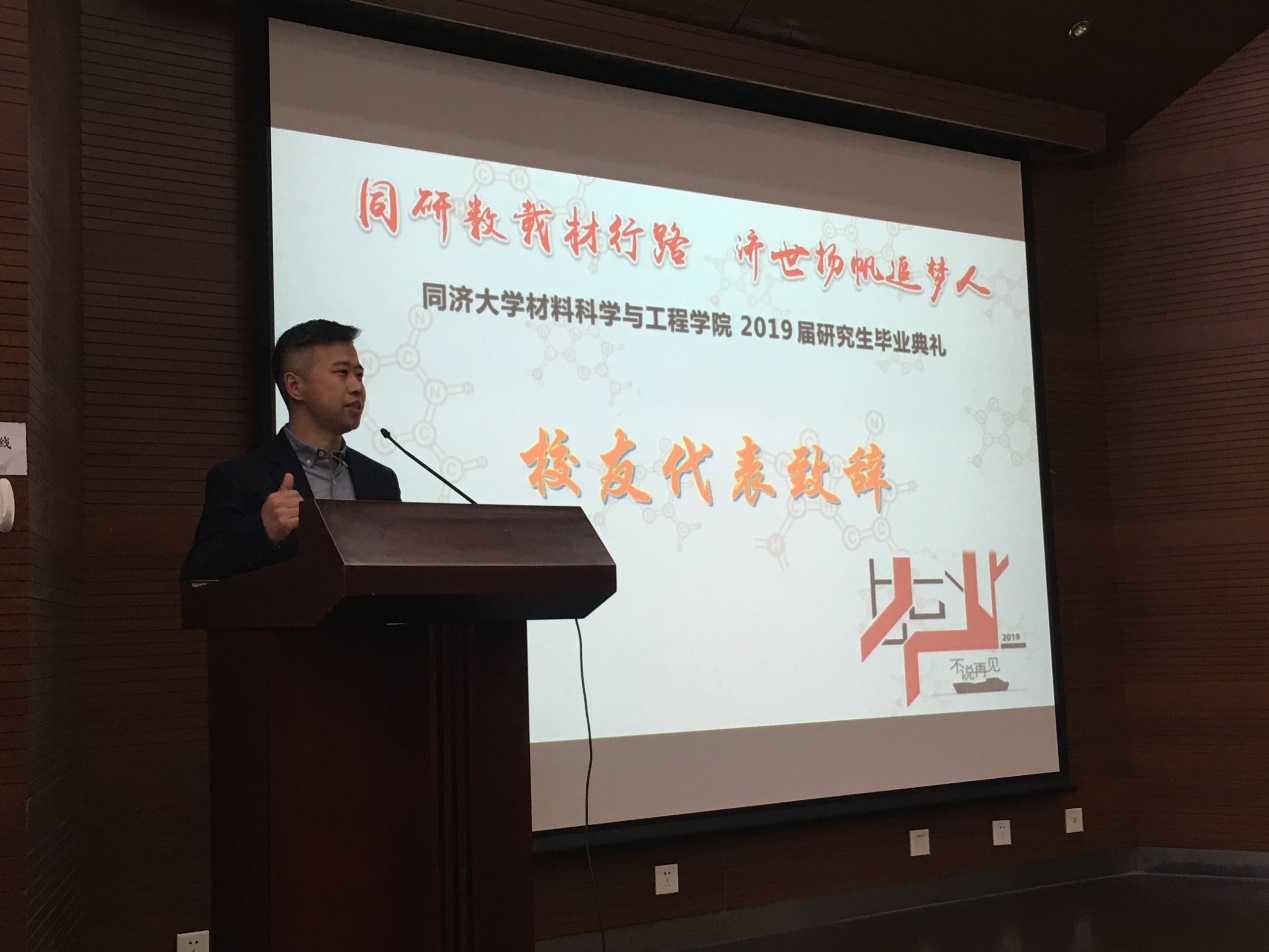 2019届研究生毕业典礼在德才馆二楼报告厅隆重举行。材料学院02届博士毕业生、上海市建筑科学研究院(集团)研发中心副主任俞海勇校友,黄片