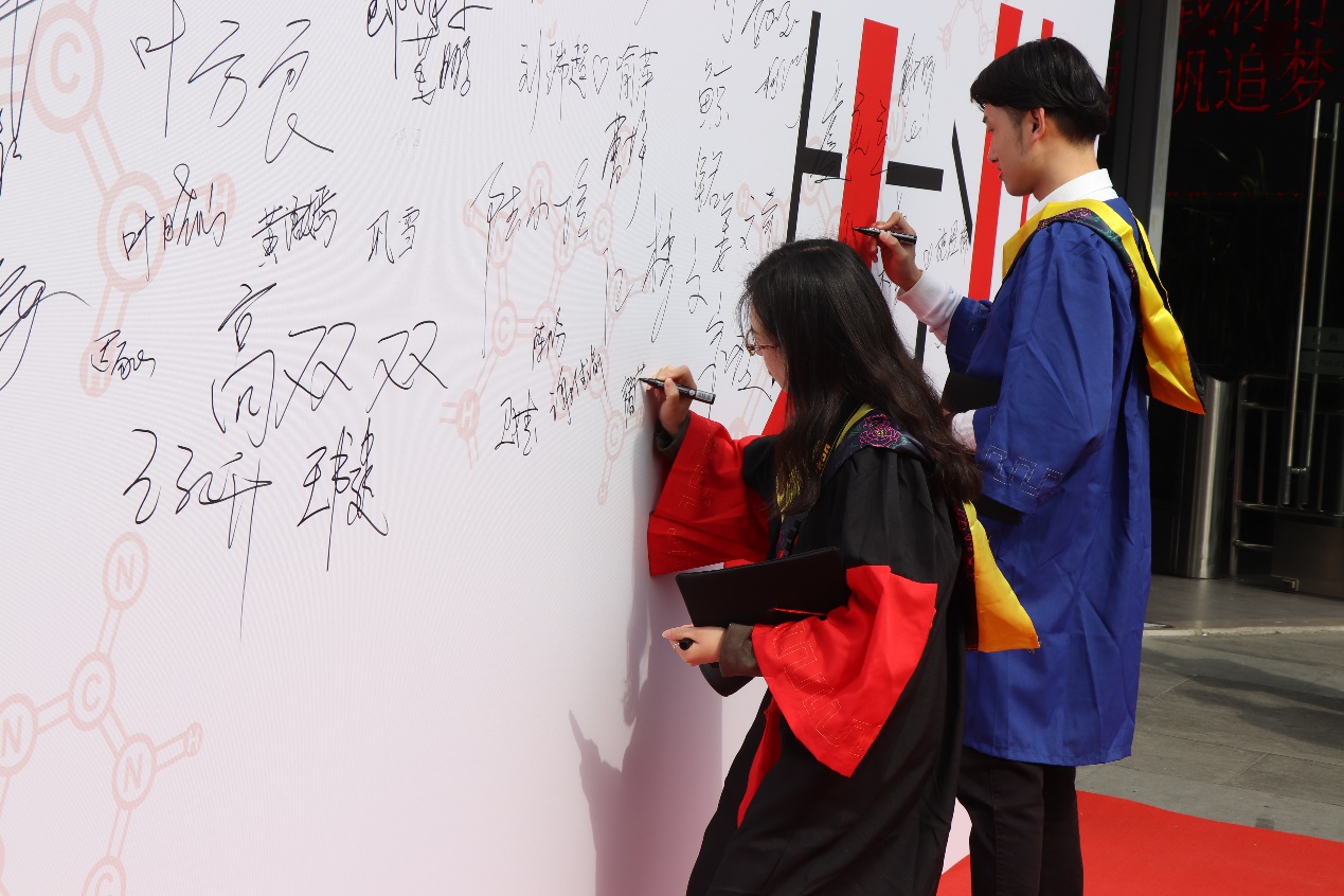 典礼前,德才馆门前的红毯与签名墙,无不代表者母校对于毕业生的不舍依恋毕业生的不舍与依恋;报告厅中,同学们携手同窗同门,抑或爱人父母,志得意满地前行。大家也纷纷在签名墙上写下自己的名字,还有对学院以及老师的殷殷祝福。