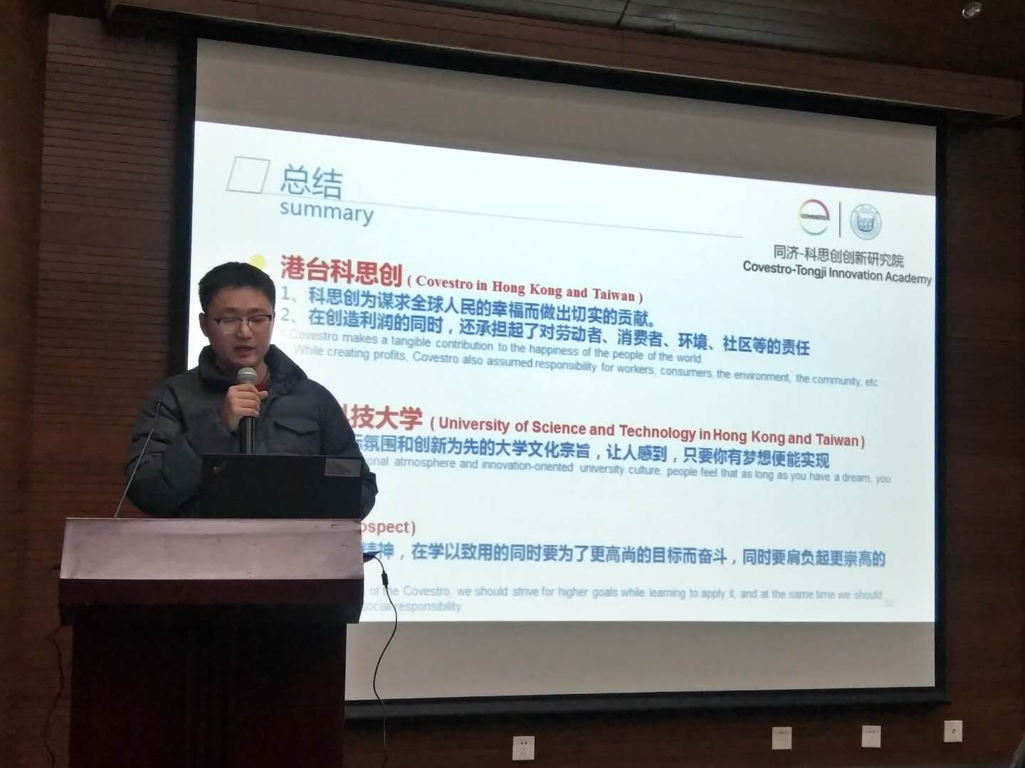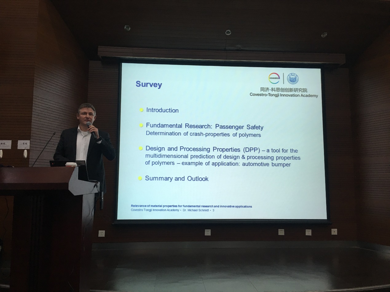 在德才馆二楼报告厅举行“同济-科思创特邀报告暨暑期实践总结大会”,学院2018级研究生、2016级本科生以及参加德国和港台暑期实践的同学前来聆听学习。本次大会共分两部分,第一部分特邀同济-科思创创新研究院院长、科思创亚太区创新负责人、科思创聚合物研发中心负责人施马可博士(Dr. Michael Schmidt)为学院师生做报告,第二部分由暑期实践交流团的学生代表——2015级本科生陈钰婷和2017级研究生王啸夫为大家做交流总结汇报。此次大会由学院党委副书记王凌凌老师主持,王德平、许乾慰、黄佳、张任远等教授出席了本次大会。