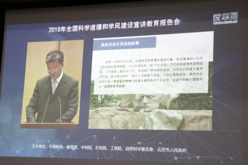 怀进鹏院士报告的题目为《弘扬新时代中国科学家精神 汇聚科技强国建设磅礴力量》。他以图文视频结合的形式,高度赞扬了中国科学家的学术操守和学术思维,彰显了伟大科学家精神魅力和精神气质所在。“未来已来,唯变不变”,科技创新构成了人类文化的基础;“科学无国界,科学家有祖国”真真切切流露了科学家的爱国豪情。“一封书信的情怀”展示科学家的忠心报国和使命担当。不同的时代有着不同的使命,茅以升、钱学森和竺可桢等“共和国的脊梁”科学家为中华民族的伟大复兴和科技强国之梦谱写了动人音符。对于青年一代,怀院士给予了殷切希望,他鼓励新时代的年轻人不畏艰难,勇于探索,开放创新,心怀梦想,引领未来。