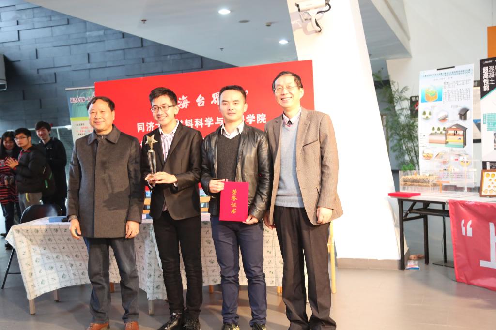 会场外阴云散去,雨势渐小;会场内讨论热烈,有声有色,这是11点的德才馆,真可谓“谈笑有鸿儒,往来无白丁”。不久后评分结束,主持人做了简短评议,然后在激昂的拉德茨基进行曲中宣布了获奖结果:一等奖的桂冠由“材料之光”摘得,实至名归;二等奖属于地聚物书桌摆件系列和彩色透水混凝土两组。黄片