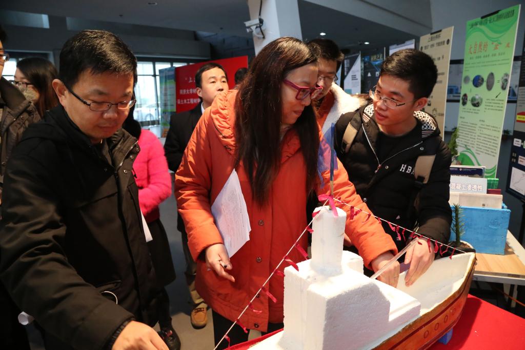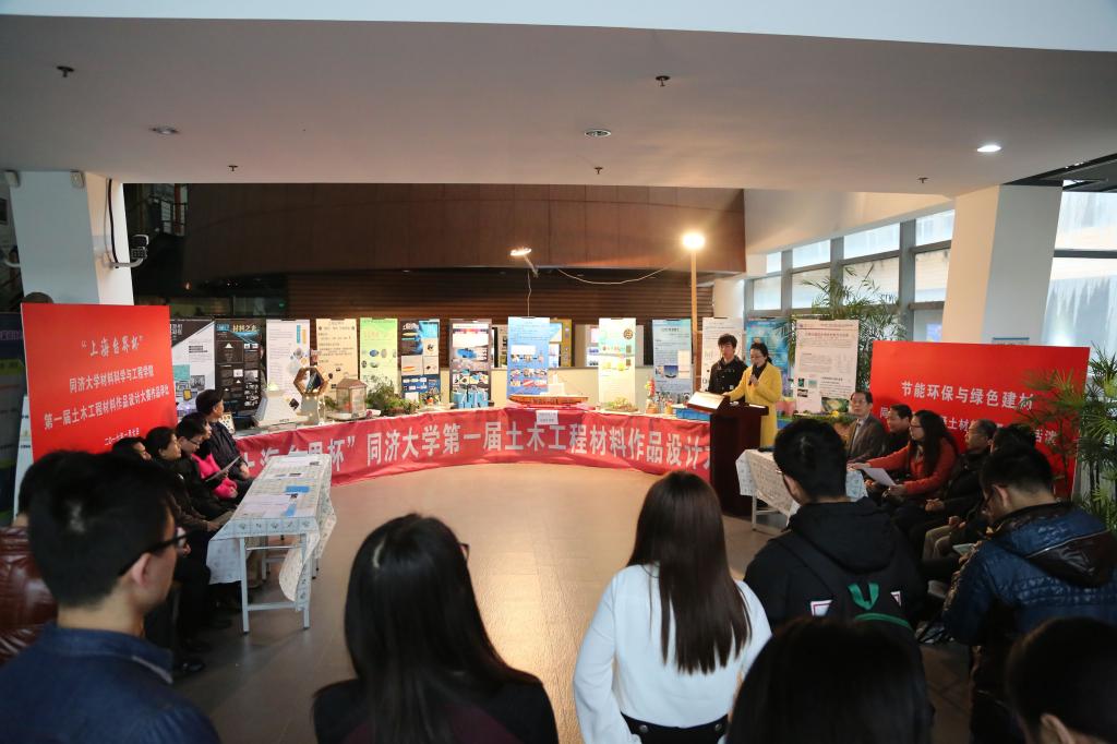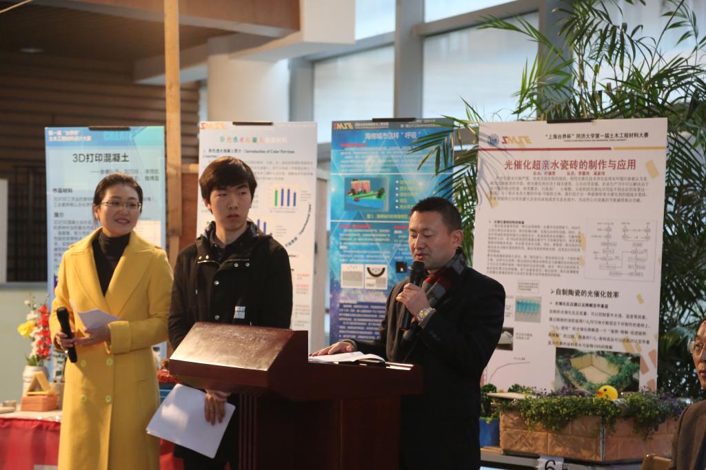 先是作品介绍阶段,各参赛组按次序由一名同学进行一段简短的作品介绍。不论是构思精巧的地聚合物书桌摆件系列,还是高端大气的“材料之光”,创意新颖的彩色透水混凝土,简洁轻盈的“砼舟共济号”……参赛队员们无不旁征博引,紧扣本次比赛的主题“节能与环保”侃侃而谈,使出浑身解数把作品和展板的精华浓缩在这1分钟里,真是字字珠玑,精彩介绍如连珠炮一般应接不暇,令人拍案叫绝。