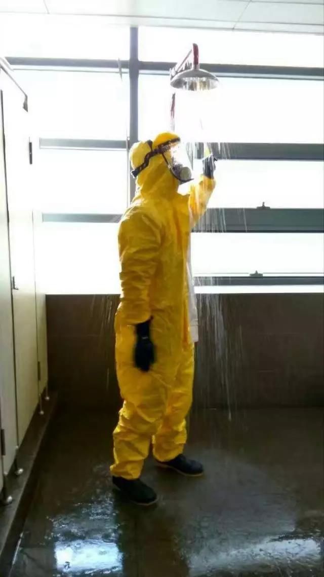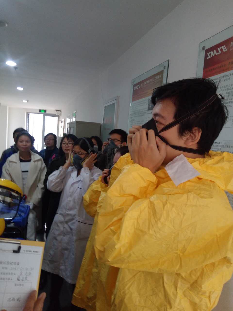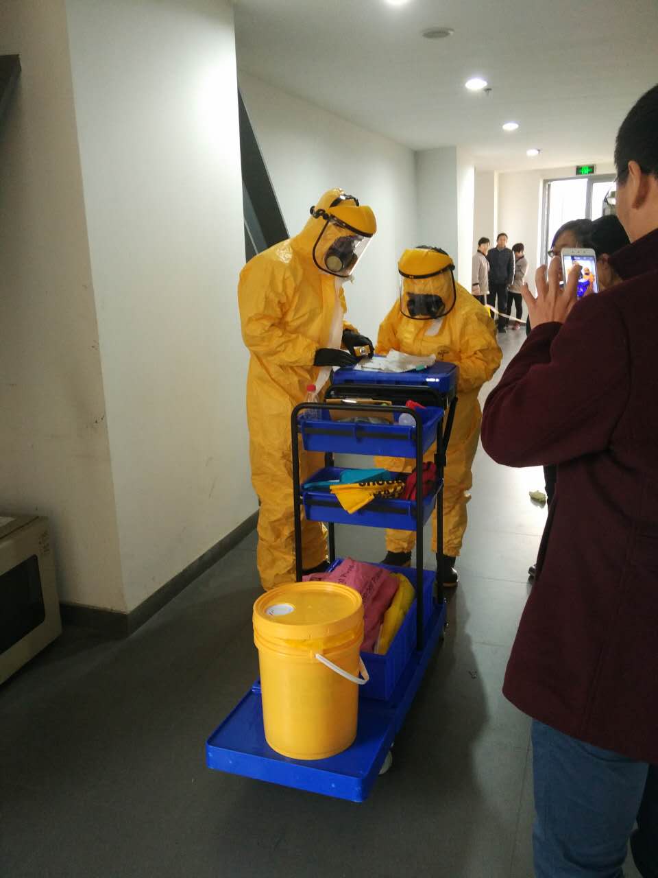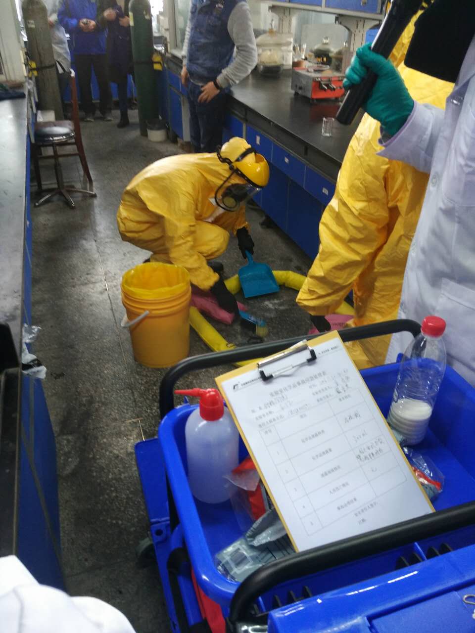 4楼高分子实验室进行了模拟300ml浓硫酸倾倒应急处置演练。我校保卫处贾晓航,设备处葛晨晨和黄片高分子系金明教授、李文峰、专业实验室朱东明老师等参加演练。