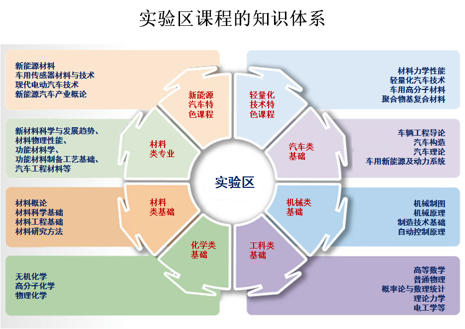 “材料-汽车-新能源复合型人才培养模式创新实验区”遵循以材料科学与工程本科专业课程体系为基础、融合汽车工程核心课程教学、强化功能材料、新能源技术、轻量化技术等特色交叉课程教学的培养模式,开展复合型人才的教学与培养工作。