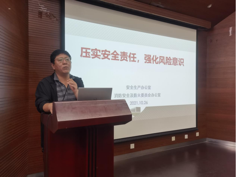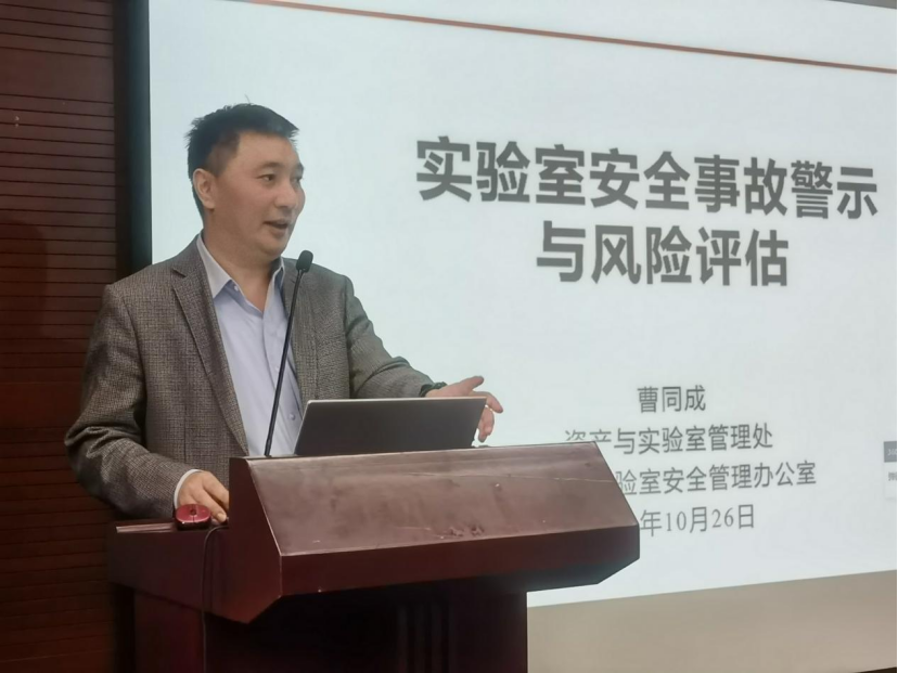 校资产处副处长曹同成作题为《实验室安全事故警示与风险评估》的报告,从《教育部关于加强高校实验室安全工作的意见》、安全事故警示、风险评估体系三个方面深入浅出向学院教师做了宣讲。他强调:实验室安全一定要坚持“预防为主”理念,面对安全生产我们不能寄希望于事后补救,更重要的事前预防,学院导师要加强学生实验室安全教育,培养安全意识,将安全融入培养学生全过程,针对课题组实验特点,做好安全风险评估,为学生提供安全整洁的学习科研环节。