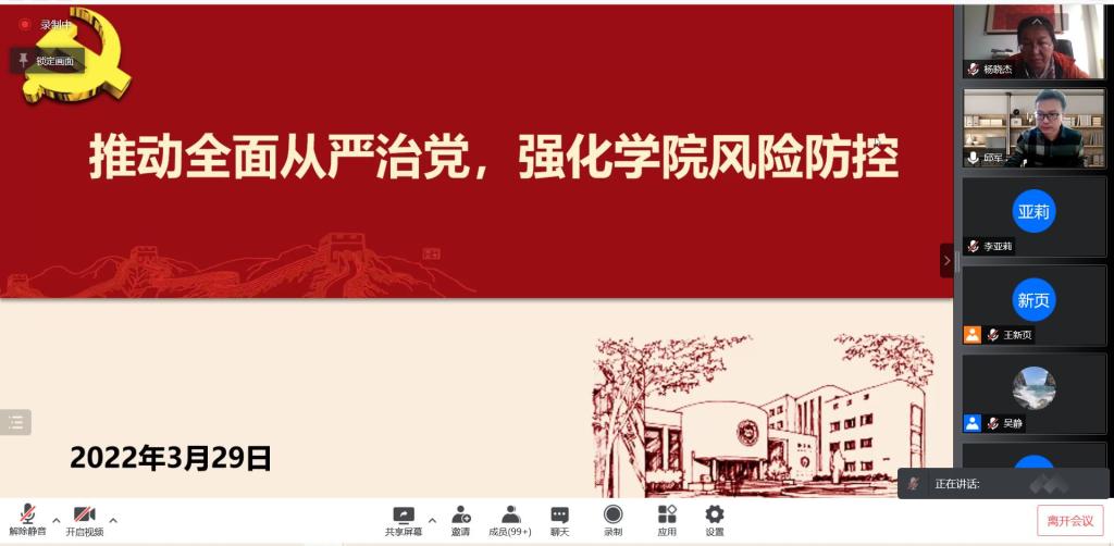 邱军副书记作了题为《推动全面从严治党,强化学院风险防控》的主题报告,带领大家深入学习贯彻习近平总书记关于全面从严治党的工作要求,贯彻落实十九届中央纪委六次全会、十一届上海市纪委六次全会和教育系统全面从严治党视频会议精神,要求我们要正确认识高校全面从严治党面临的形势任务,同时回顾总结了学院存在的问题和风险隐患。指出,我们要认真学习、深刻领会这次会议精神,以自我革命的精神和敢于担当的勇气,真抓实干,务求实效。我们要强化风险意识,牢牢守住学校政治安全底线,以实际行动迎接党的二十大胜利召开。