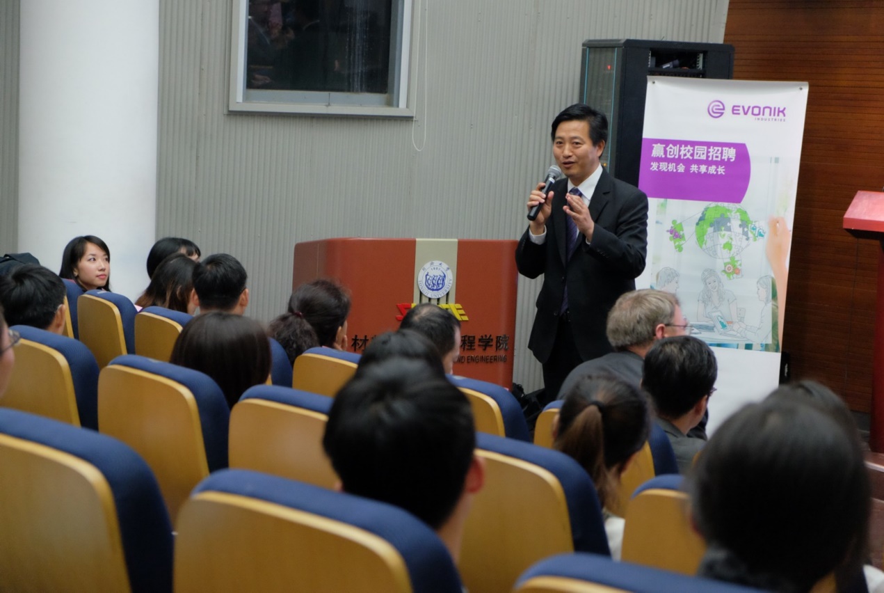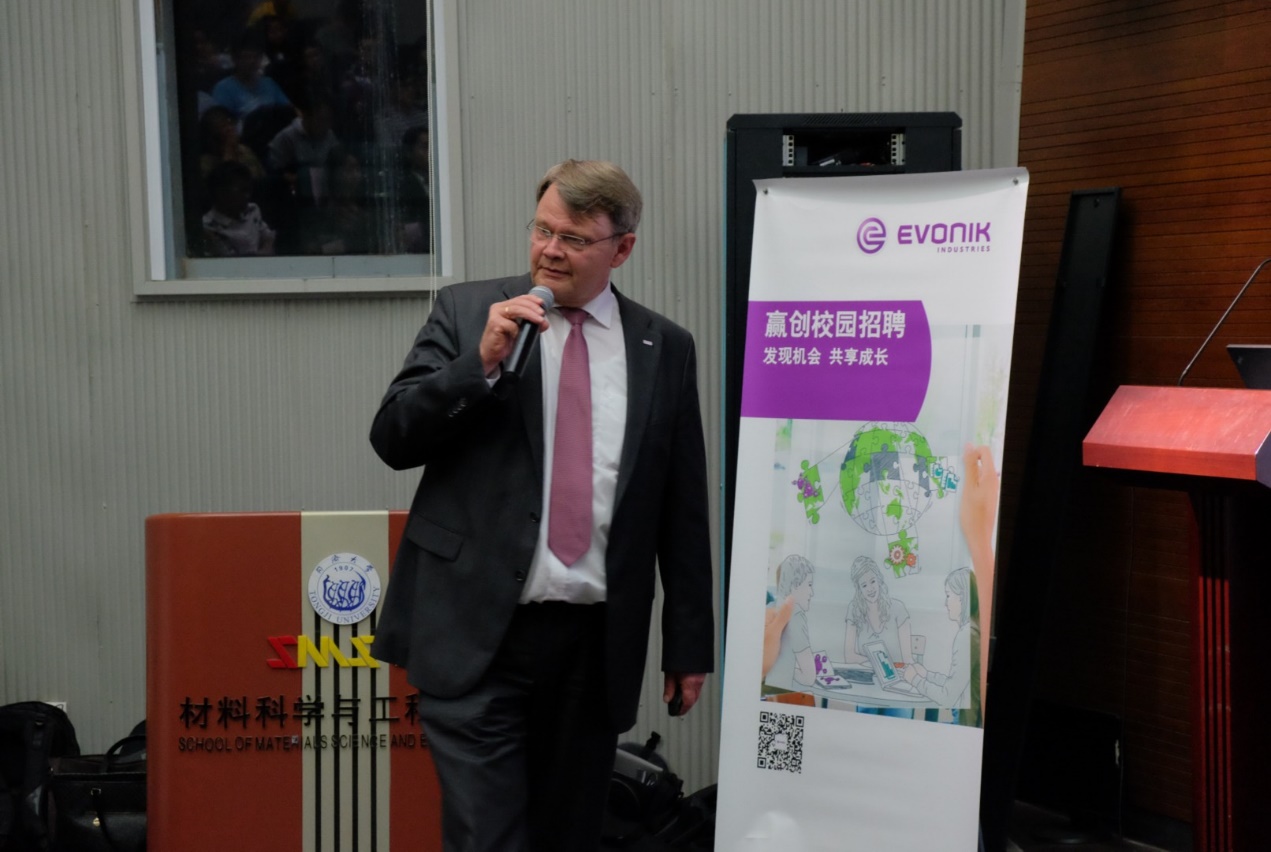 20161017日晚,赢创2017同济首场招聘会在黄片 嘉定校区材料黄片 德才馆顺利举行。赢创大中华区总裁柯乐施(Dr Claas Klasen)博士、赢创特种化学(上海)有限公司总经理陈金秋博士、赢创德固赛(中国)投资有限公司人力资源总监程大年、赢创特种化学(上海)有限公司业务项目经理陆芳(同济校友)等做客宣讲会,黄片 副院长邱军、党委副书记王凌凌出席。来自同济、交大等高校的各专业的2017届本、硕学生约100人与会。