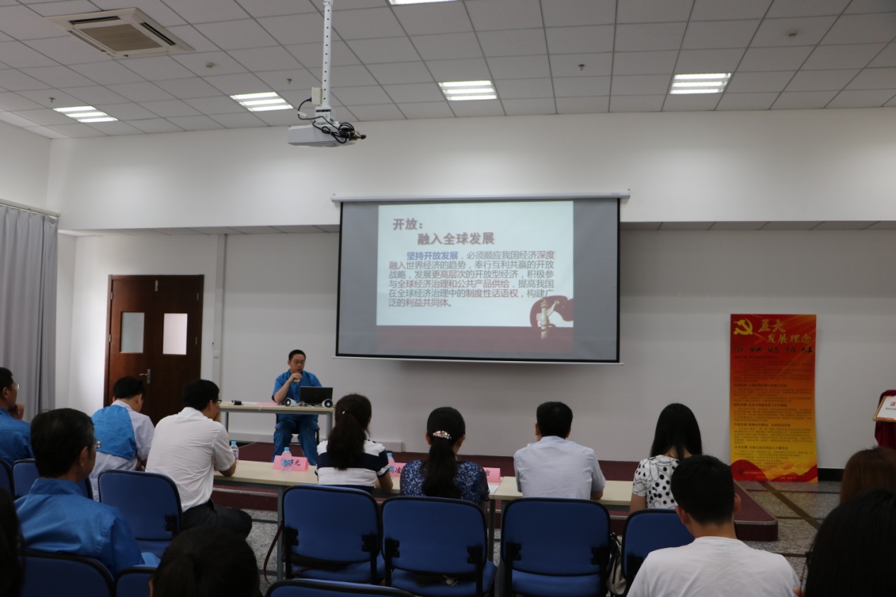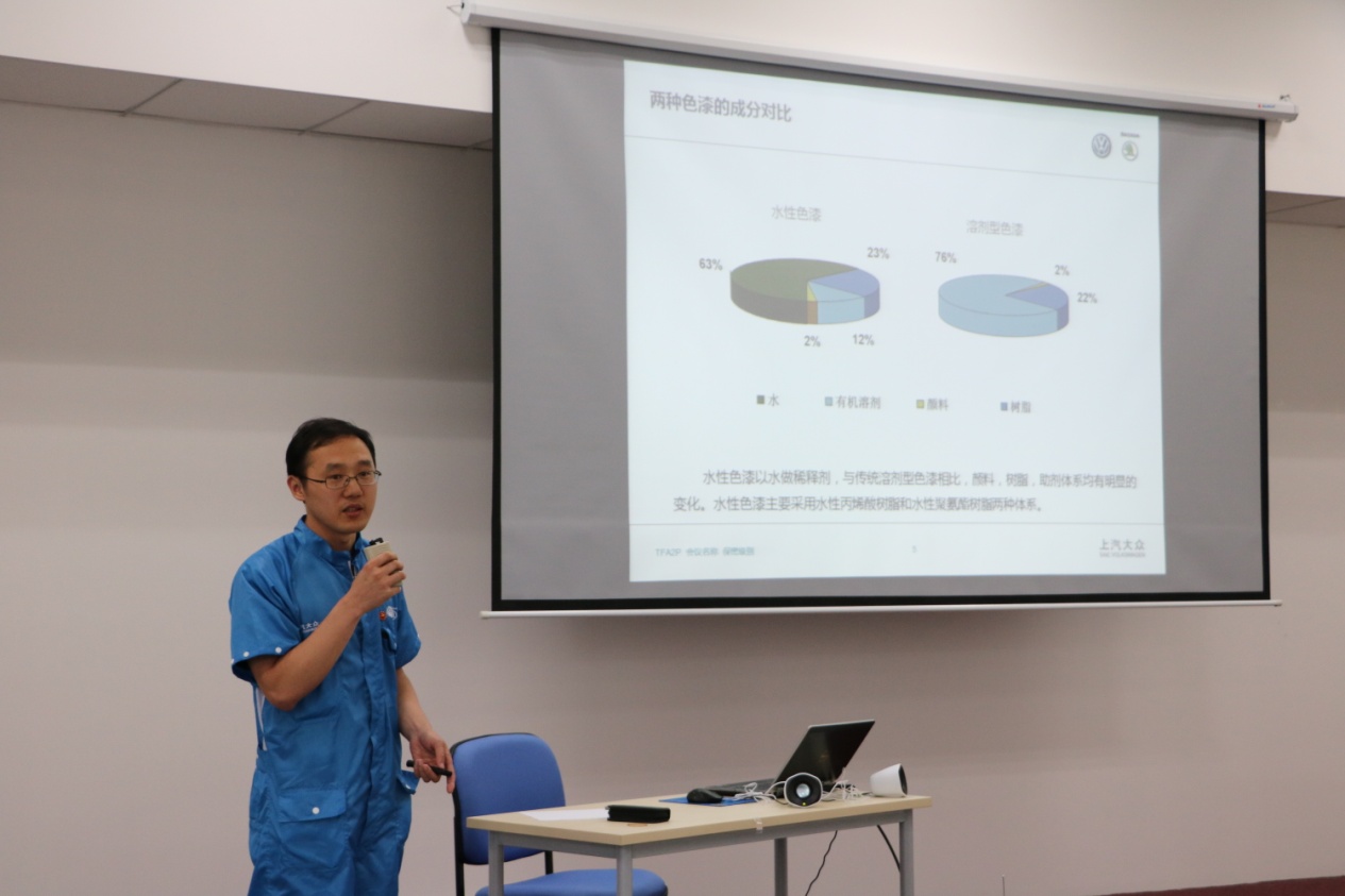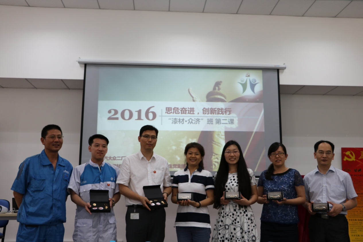 揭幕仪式结束之后,《漆材·众济》讲堂第二讲——理论篇开讲。随后是来自上汽大众安亭汽车二厂一支部的宣传委员陈杰同志带领党员们学习了“五大发展理念引领中国未来”的报告,使全体党员领会到“五大发展理念”中发展的动力、平衡、载体、空间与成果是一个有机整体,大家对“五大发展理念”形成全面的领会,党员同志在学习之后积极发言交流学习感受,针对学生党员而言,需要积极参与创新项目,成为综合型、全方位的高素质人才,拥有开放包容的性格与公平的心态。对于企业,需要创新的科学技术、协调企业结构与产品形式、提高持续发展的能力、坚持“走出去”的理念、构建和谐的发展体系,促进企业综合竞争力的提升。随后来自上汽大众安亭汽车二厂一支部的王宗明同志为学生党员介绍了“2010v涂装工艺”,对水性漆、溶剂性漆的应用、优缺点及区别做了详细介绍,使学生党员对于涂装工艺形成初步认识。接着,黄片