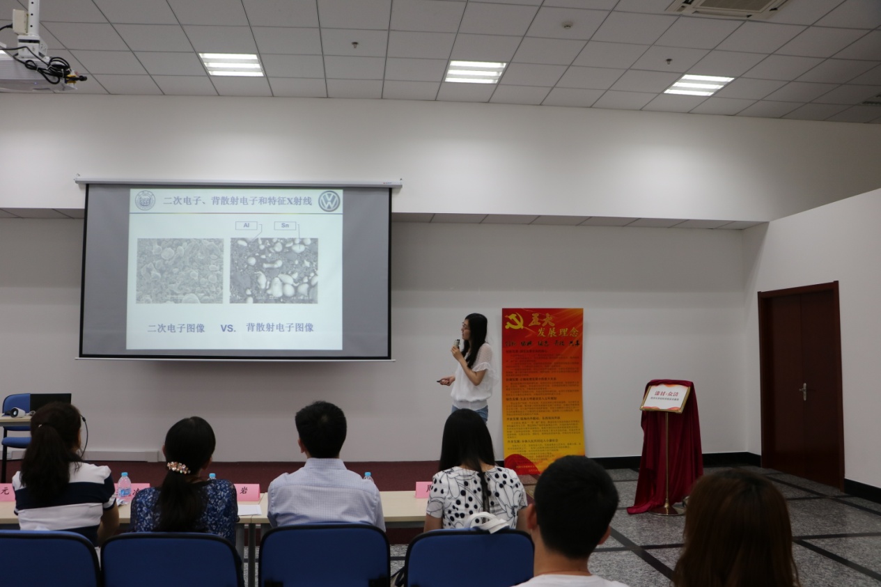 高分子系研究生党支部党员黄秋桐同志,为全体党员讲解了“扫描电子显微镜及能谱分析仪”,使企业党员对于材料表征技术具有更为直观的了解,为后期双方在专业方面的合作奠定基础。