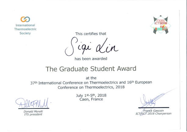 2019届直博研究生林思琪也将自己青春献给了科研,做人之不愿做,行人之不敢行,立足基础,终于厚积薄发。林思琪在实验室从小事做起,也坚信所有科学问题都源于最简的开始。她搜集了现有报道的所有热电材料的热导率及声子结构的信息,并发现低声速、低声学截止频率等有效实现低晶格热导率的指导思路,以此开发了晶格热导率低如木头的硫银锗矿材料。五年的博士生涯,她发表SCI论文31篇热电论文,第一/通讯作者论文7篇,其中包括Cell姊妹刊和Nature子刊2篇。鉴于在热电研究的成果和贡献,被国际热电学会授予2018 ITS Graduate Student(每年遴选2名博士生)和ICT Best Poster等国际荣誉奖项。而今,博士毕业的她选择了在黄片