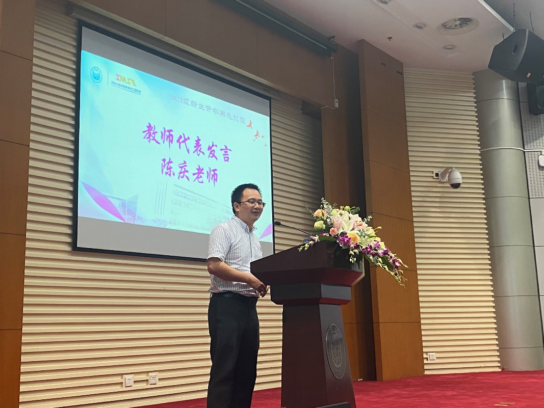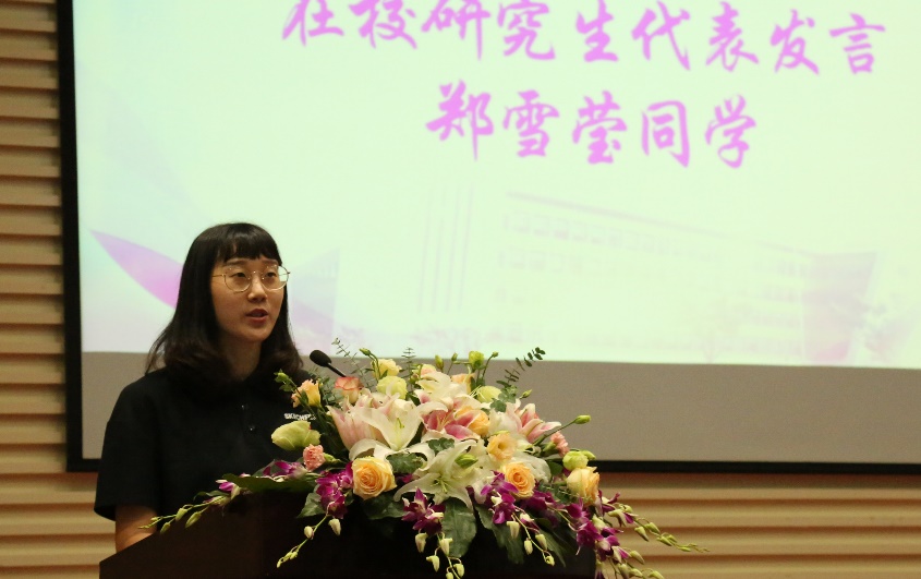 2019级春季博士研究生、2021年学校“追求卓越学生奖”获得者郑雪莹同学作为老生代表发言。她将自己的心得体会毫无保留地分享给在座的各位新生,首先是梦想的力量,研究生阶段将是拾起并接近梦想的最佳时机。你将有大把的时间去自主探索自己的课题,自学更多项技能,或是结识更多小伙伴。三年或者五年的硕博时间,足以让大家变得大不相同。其次是坚持的力量,必须要有长期坚持的决心,在未来的研究生生活中规划好自己的每一天,做到每天不荒废,就能每天离梦想近一点,直至成为自己领域的小专家。最后是实践的力量,材料领域的学习围绕着阅读文献,规划实验和实施实验而展开,通过不断地思考和与老师同学的讨论,得到的每一个新的实验方案都是一种进步,大家在不知不觉中得到了成长。