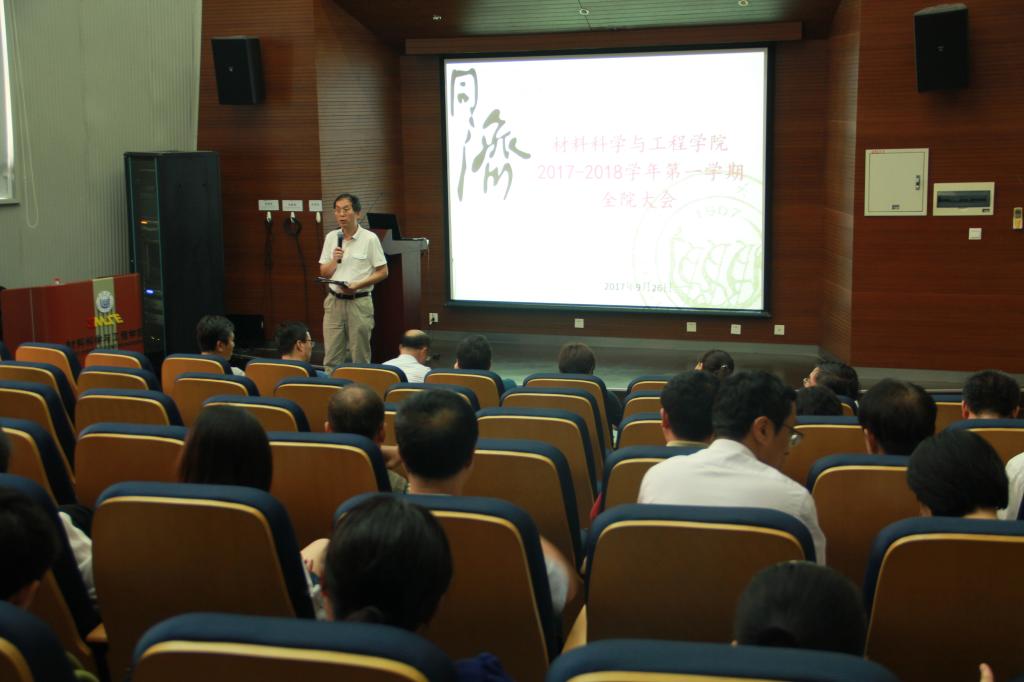 9月26日下午,材料黄片 2017-2018学年首次全院大会在德才楼二楼报告厅召开,黄片 教职员工100余人出席会议,黄片 党委书记王中平主持会议。